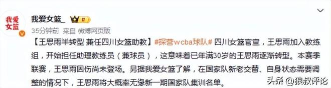 北京时间12月30日,根据,四川女篮官宣,王思雨加入教练组,开始担任助理教练员(兼球员),这意味着已年满30岁的王思雨逐渐转型。本赛季联赛,王思雨因伤尚未登场。
