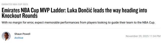 - NBA杯MVP排名:东契奇领跑亚历山大第二 里夫斯第四詹姆斯未上榜