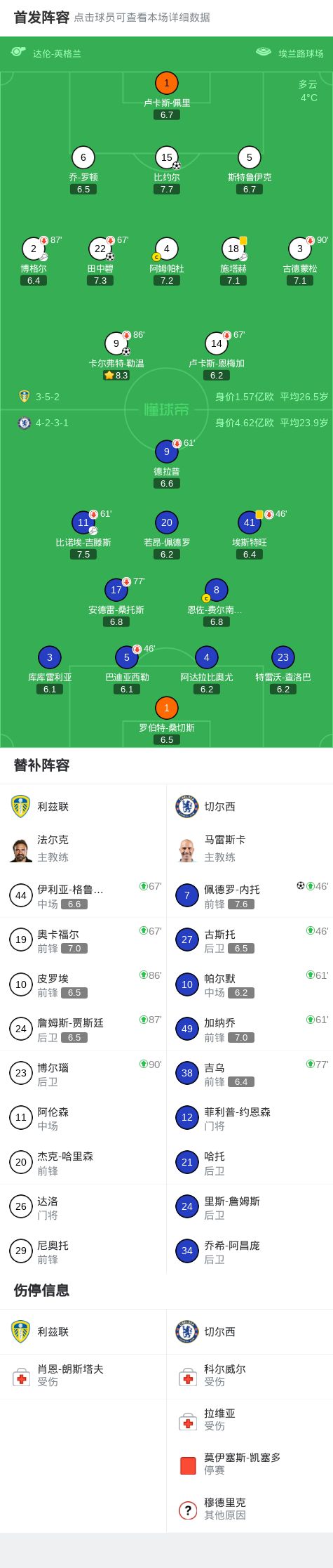 北京时间12月4日,英格兰足球超级联赛第14轮展开较量,利兹联坐镇主场迎战切尔西。上半场,比约尔闪击,田中碧轰世界波。下半场,内托替补登场为切尔西扳回一城,随后阿达拉比奥尤送大礼,卡尔弗特-勒温抓住机会破门。最终,切尔西1-3客负利兹联。